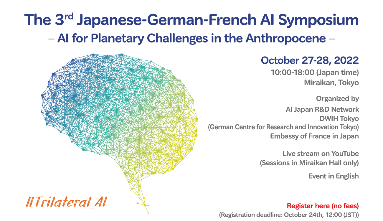 The “3rd Japanese-German-French AI Symposium: AI for Planetary Challenges in the Anthropocene”, organised by the AI Japan R&D Network, DWIH Tokyo, and the Embassy of France to Japan, will take place on October 27 & 28 at Miraikan in Tokyo.